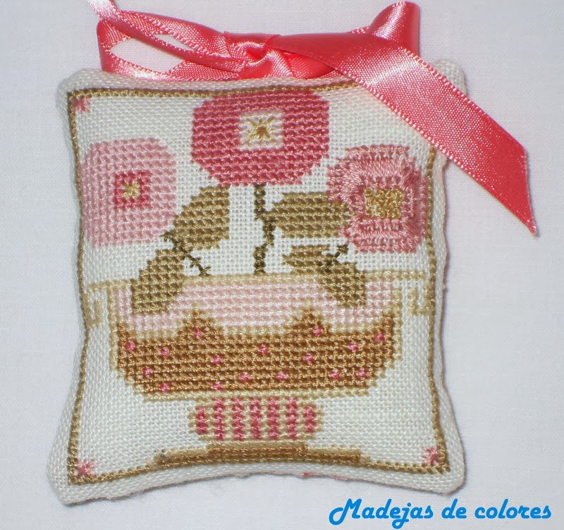 Este es un cojincito para la argolla, me encantó en cuanto lo vi, y ya sabia para quien iba destinado, es un diseño de Ewe & Eye Friends " Flower Scissor Companion".