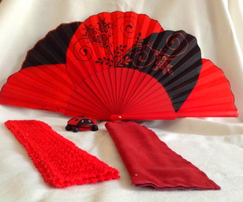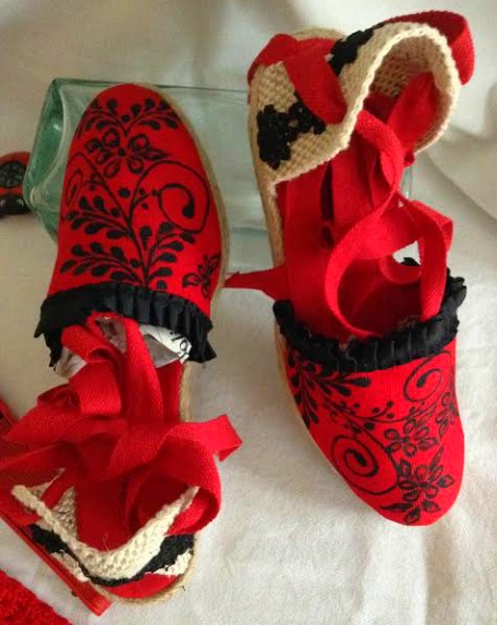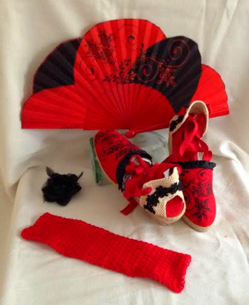 A juego lleva estas alpargatas rojas que yo he tuneado con el volante negro,va cosido,con adorno de puntilla negra también cosida y pintado a mano conjuntado con la decoración del abanico.