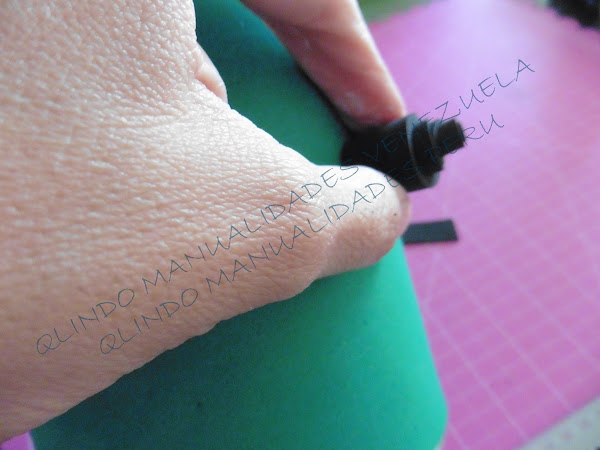 Frankie lleva a cada lado de su cabeza unos tornillos para ello enrollamos la tira de foami negro como se observa en la foto, dejando que el microporoso vaya saliendo cuando enrollamos,