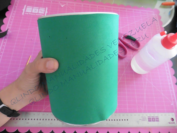Para el dulcero de Frankie vamos a utilizar una lata de leche grande, pero tu puedes utilizar cualquier envase, solo adaptas los moldes al tamaño del envase.Observa en la foto que he recortado una pieza de microporoso verde grama y lo estoy pegando con silicona liquida por todo el alrededor de la lata.
