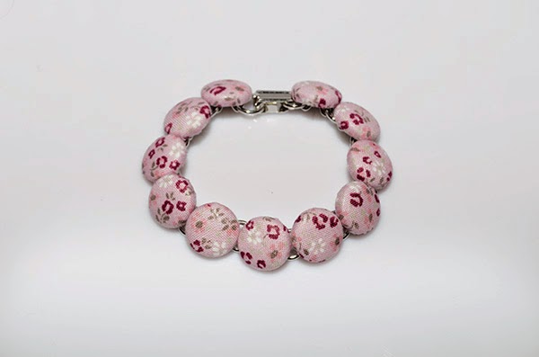 ...una pulsera con botones forrados con tela, con florecitas en tonos rosas y lilas, ¡pensando ya en la primavera y el buen tiempo!...