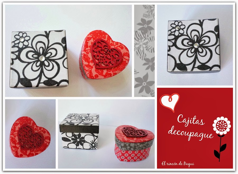 Obviamente, El rincón de Baqui tenía que aportar algo y me decidí por estas dos cajitas forradas con la técnica del decoupage, ligeramente decoradas.