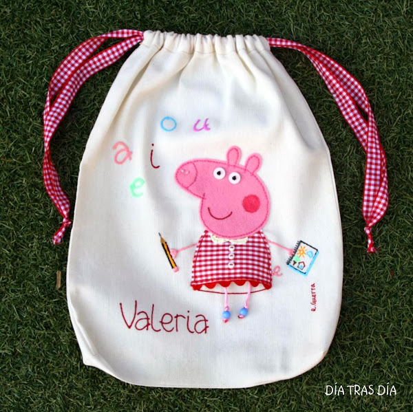 Y hace unas semanas me comentó que quería hacer un sorteo de cara a las Navidadesen el que le gustaría que participasen algunas de las artesanas de las que había hablado en su sección. Yo acepté encantada a colaborar y le ofrecí para su sorteo una bolsita de merienda decorada con Peppa Pig en el cole o con George con su dinosaurio, para que haya opción para niñas y niños.