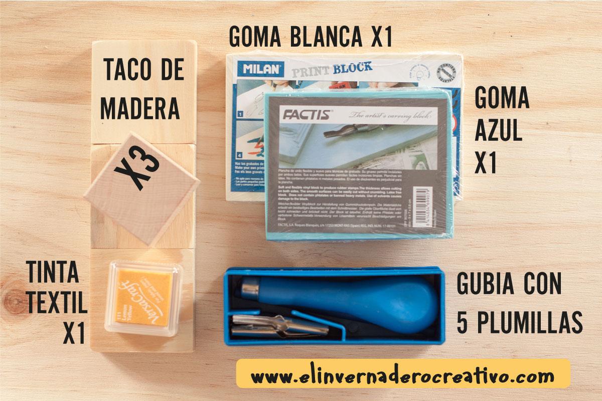 El kit contiene una goma blanca, una goma azul, una gubia con 5 plumillas intercambiables, un tampón para sellos con tinta textil y 3 taquitos de madera. Además unas súper instrucciones diseñadas por nosotros.