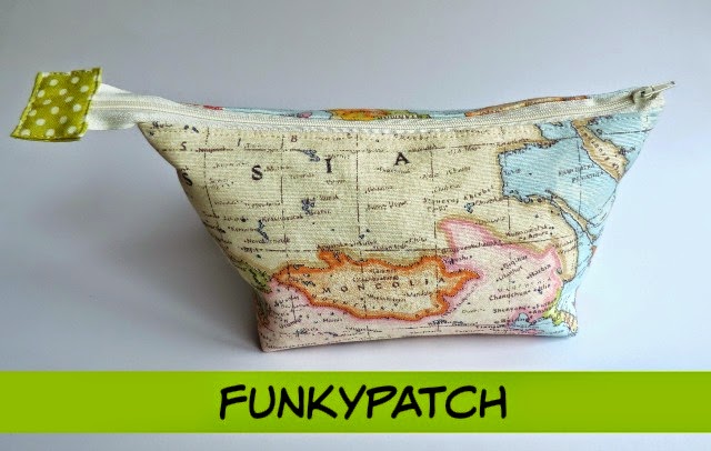 Un neceser con estampado de mapa que mide 11.50cm de largo x 12.5cm de alto y 8.5cm de ancho hecho a mano para la ocasión.