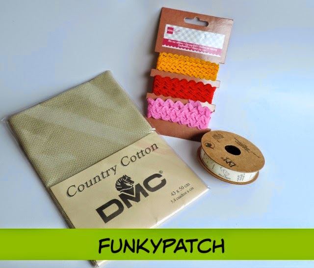 Estas otras cositas las he ido comprando poco a poco: una cinta de tela con dibujos, cintas de rick rack (picunela) en 3 colores y tres anchos, tela para punto de cruz de la marca DMC.
