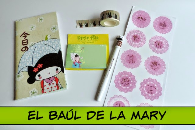 No me enrollo más y os enseño detalladamente lo que hay en el lote.El Baúl de la Mary: una libreta Kokeshi, unos stick notes de quita y pon, una lámina con 10 etiquetas con forma de blonda, un washi tape de conejitos y un bolígrafo "Moustache" de punta fina.