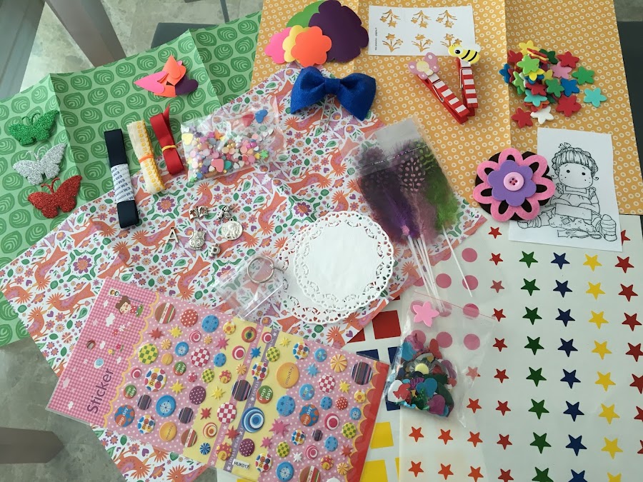 -El lote consta de: 3 láminas de papel estampado, 2 láminas stickers de variados, 2 bolsitas con adornos, charms, estampación de muñeca, 2 blondas, 3 cintas de tela para decorar, stickers temática pop, bolsita con plumas, 1 clips lacito, un broche de flor, 2 pinzas decoradas, 3 troquelados de mariposas, un llavero para custodiar, pegatinas con forma de corazón y de flor, y troquelados de flores.