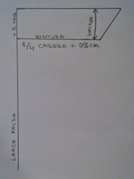 - Primero dibujamos una línea vertical, de arriba a abajo, que mida el largo de la falda (4) más 5 cms. para la vuelta de la vaina en la cintura.