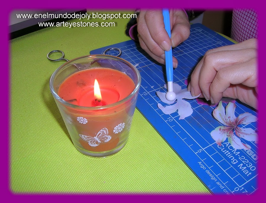 Para realizar el trabajo necesitamos: laminas, tijeras, buriles redondeados (en mi caso son los de trabajar el fondant que compro en los chinos), una vela y pistola de silicona caliente.