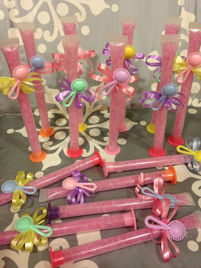 Con las hojas de color haz 2 círculos de diferentes tamaños, y en colores diferentes, en el mas pequeño escribe lo que contiene el tubo, para que nuestro invitado sepa de que se trata, pega este circulo en el otro circulo mas grande, en un costado haz le un orificio y pasa le un pedacito de cinta de regalo.
