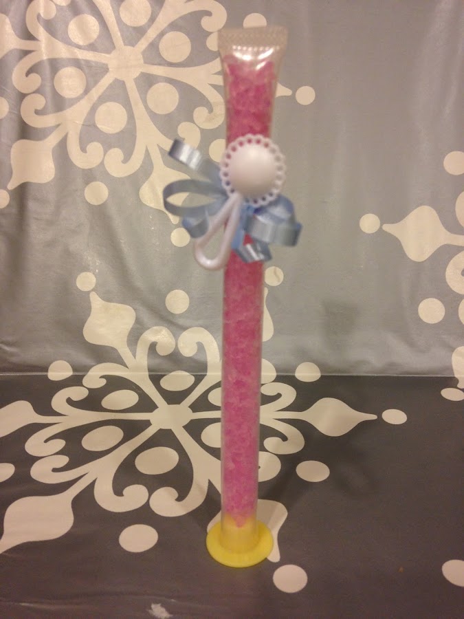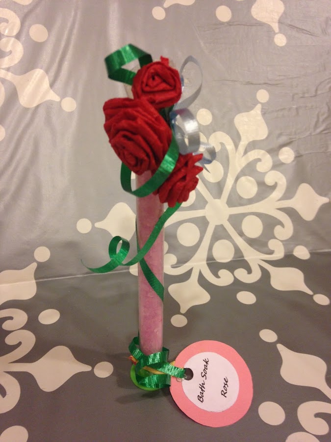 Una variante de este souvenir, seria hacer unas rosas de papel crepe y pegarlas en el tubo con una cinta de regalo en color verde enroscada.
