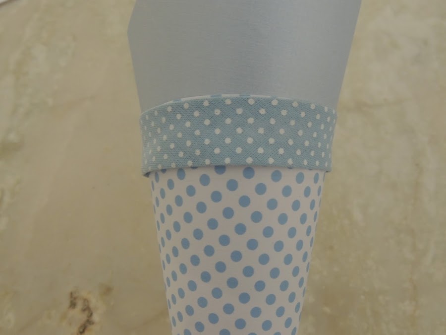 Para finalizar, le pegamos una cinta biés, o cinta bebe, en la división de los dos papeles, para tapar cualquier imperfección, y a la vez darle un toque mas dulce al cono.