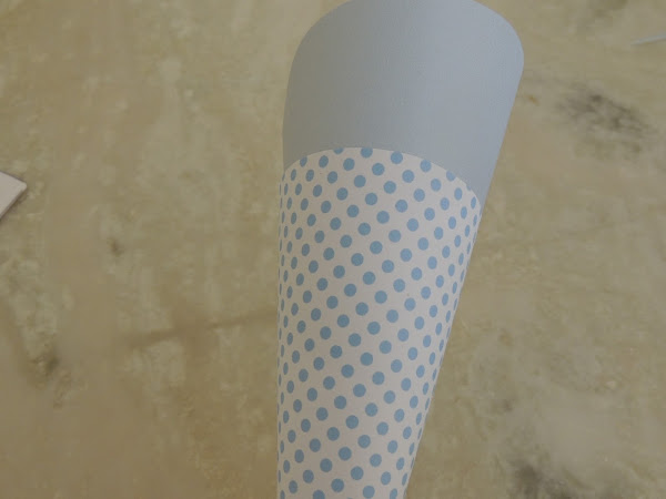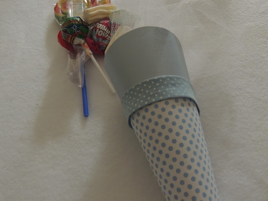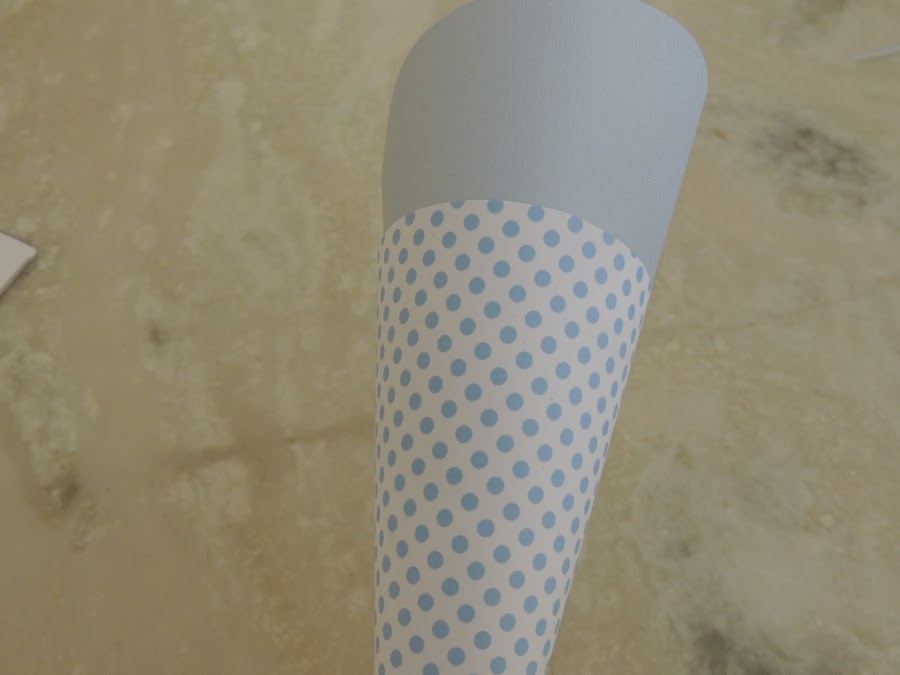 Para finalizar, le pegamos una cinta biés, o cinta bebe, en la división de los dos papeles, para tapar cualquier imperfección, y a la vez darle un toque mas dulce al cono.