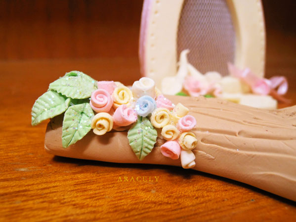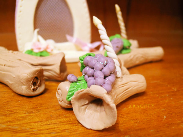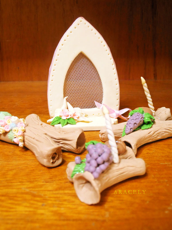 Los otros troncos llevan sobre si, un ramo de uvas, unos panes y una vela rustica, e igualmente los acabe con diamantina. Los troncos fueron modelados y detallados a mano.