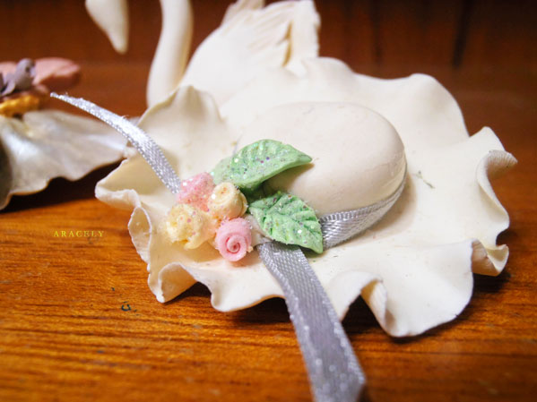 El primero que presento, es este mini sombrero que no mide más de 5 centímetros de diámetro, el cual está decorado con cinta satinada, mini pimpollos y mini hojas. Ha estas alturas ya deberías de adivinar que soy fan número uno de las miniaturas, si me fuera posible estaría el día entero admirando estos mini trabajos que se realizan.
