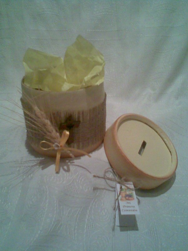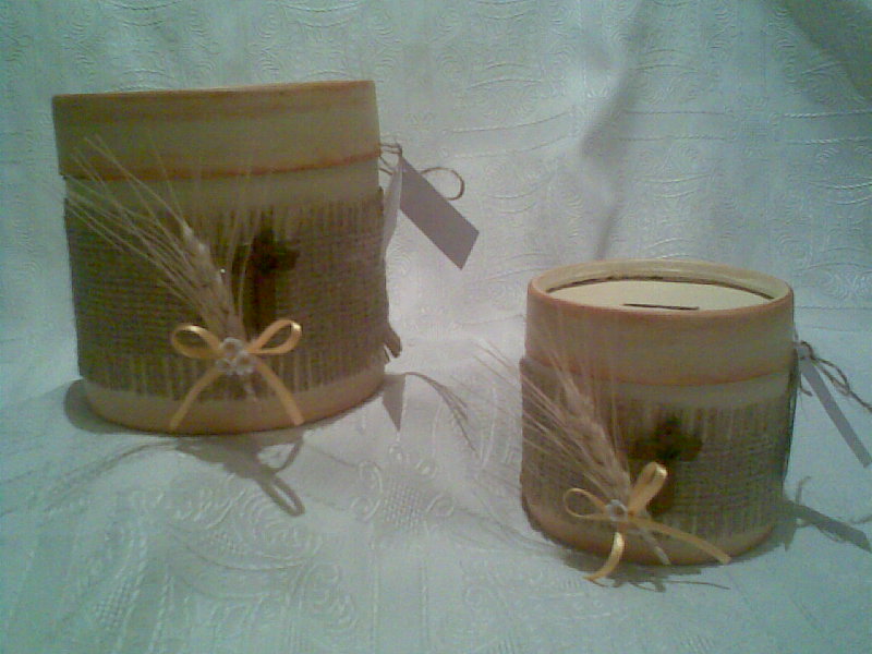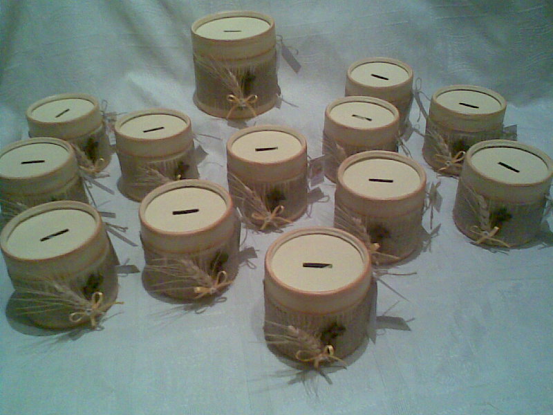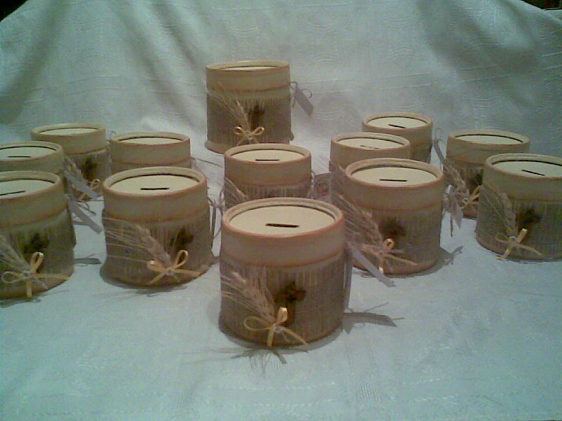 Los realice en cajas redondas de cartón, las pinte con acrílico color manteca y les hice un flotado en marrón en los bordes. Cale las tapas para formar la ranura de la alcancía.