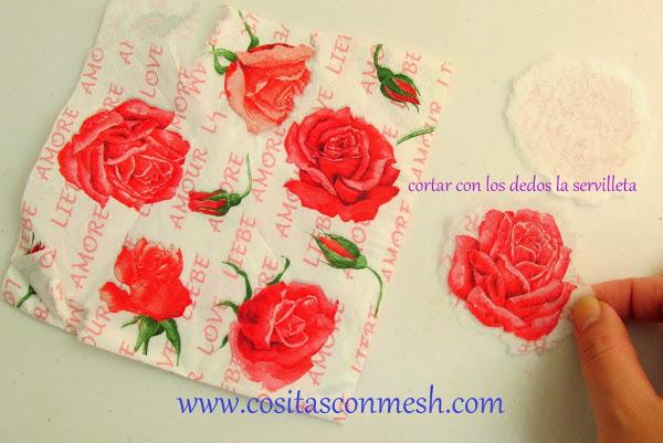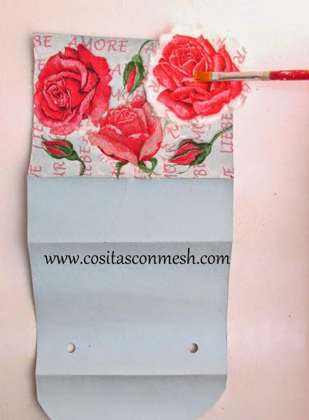 3.-Usamos servilletas para decorar la carterita,con los dedos cortamos el diseño de la flor y quitamos los 2 papelitos que vienen pegados en la servilleta.