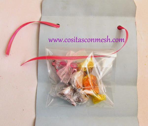 8.-Ya que termine de decorar mi carterita de 15 años,hago bolsitas de chocolates y con un listón las amarro dentro de la carterita,ese sera el regalo dulce para las invitadas :).