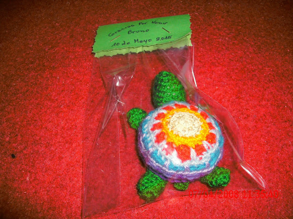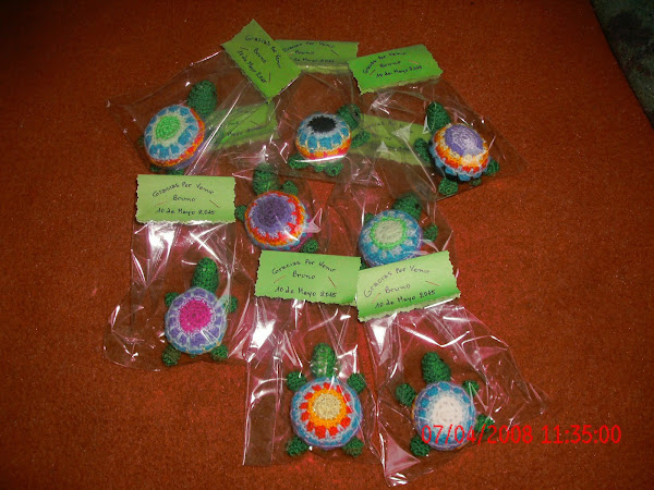 CUANDO LAS ARME NO LLEVE LA CÁMARA DE FOTOS, POR LO TANTO NO TENGO FOTOS, POR AHORA, PERO EN LA TORTUGA GRANDE LE PUSE UN CARTEL CON EL NOMBRE DE MI NIETO ,PARA PINCHARLO EN ELLA UTILICE UNOS PALITOS DE BROCHET FORRADOS CON PAPEL AFICHE EN COLOR CELESTE, ESPERO LES GUSTE Y DEJEN ALGÚN COMENTARIO, GRACIAS POR LA VISITA