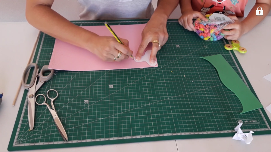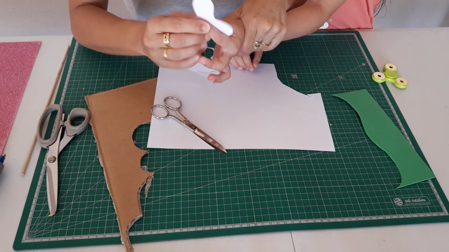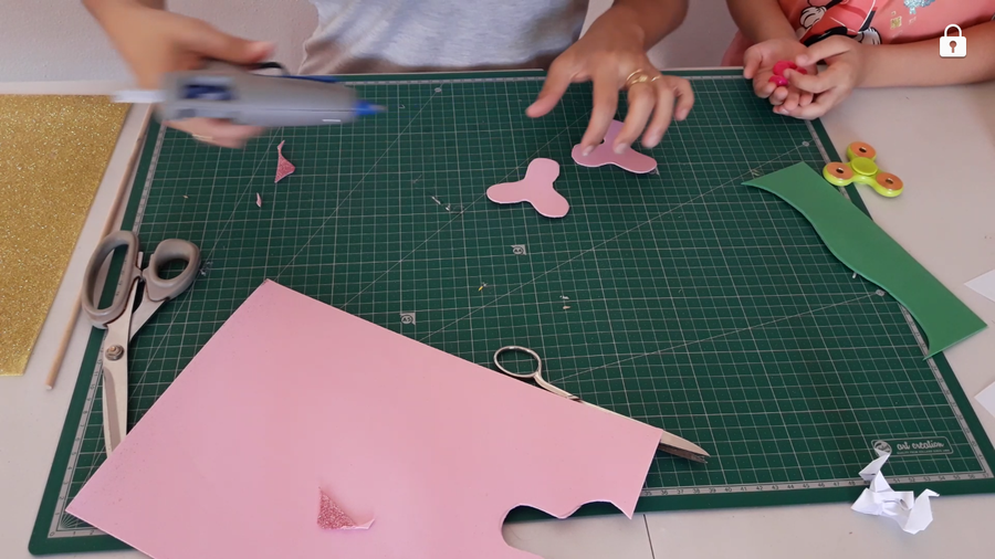 Con uno que teníamos cortamos el molde para hacerlo. Pero antes de marcarlo en la goma eva lo medi en la mano de las niñas y el peque para ver que giraría y no hacerlos mas grandes que sus manos claro. Después lo recortamos en goma eva.