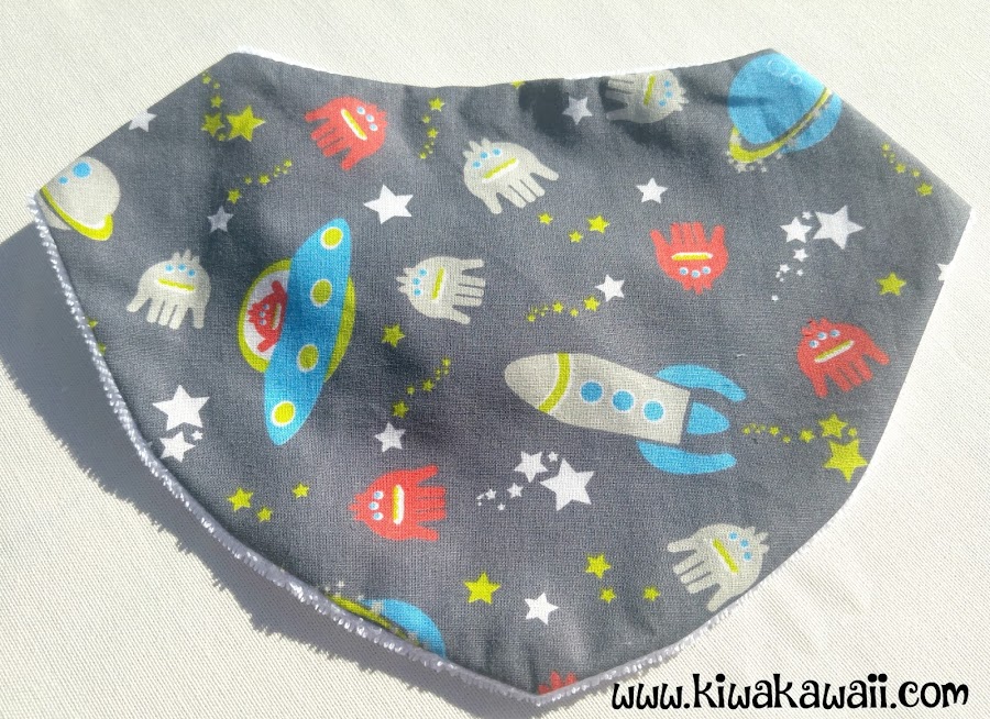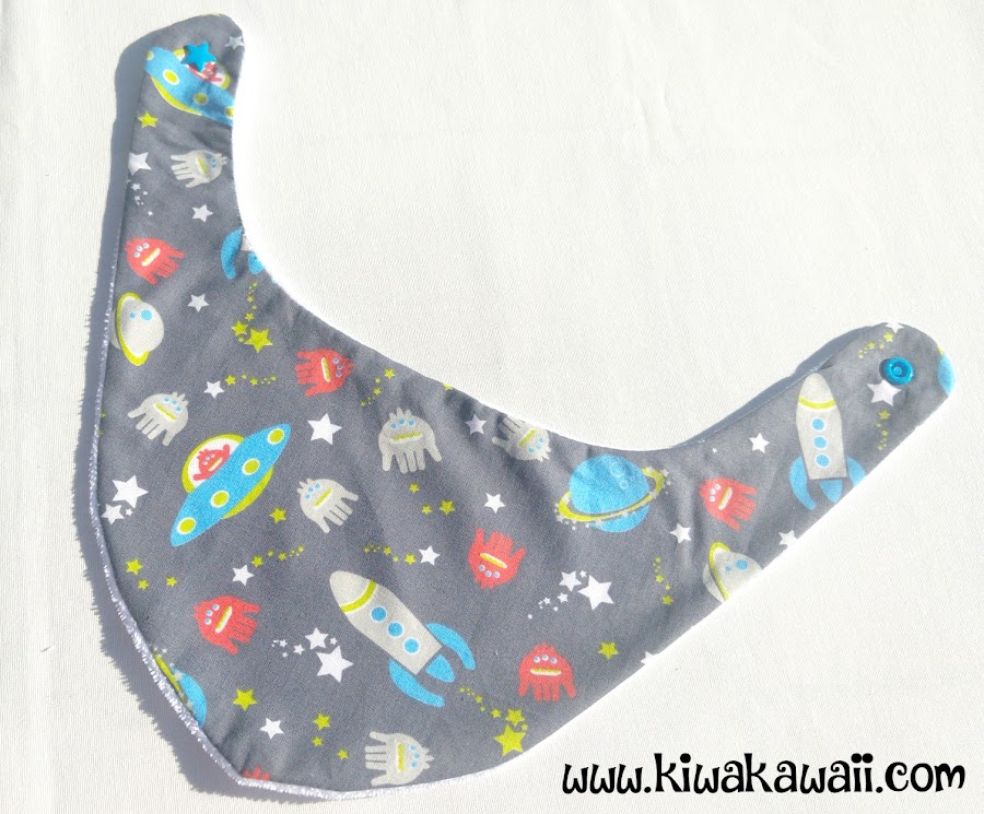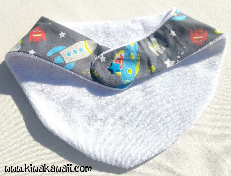 La bandana del espacio es de algodón tipo patchwork con la parte trasera también de microrizo, lleva como cierre un snap de estrella.