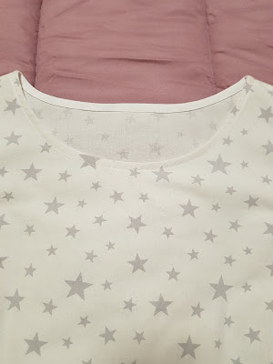 El tejido es de algodón con el fondo de color blanco y con el estampado de estrellas en diferentes tamaños , ese es un detalle que me gusta mucho , en color gris claro , también estaba este mismo tejido en color rosa con las estrellas en color blanco pero no me acababa de convencer creo que este con el fondo en color blanco es más combinable .