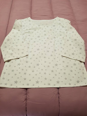 El patrón de la blusa , ya que al final me decidí por coser una blusa en vez de una camisa , es básico ya que quería que se lucieran bien las estrellas tejido , lleva pinzas en el pecho , manga 3/4 y cuello redondo .