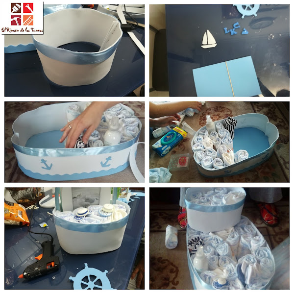 Lo siguiente fue hacer la parte de arriba de igual manera que la parte de abajo pero más pequeña, y con la goma eva, más decoración marinera y por último lo más divertido, fuimos metiendo los pañales, intercalados con los regalos, bodys, chupetes etc.