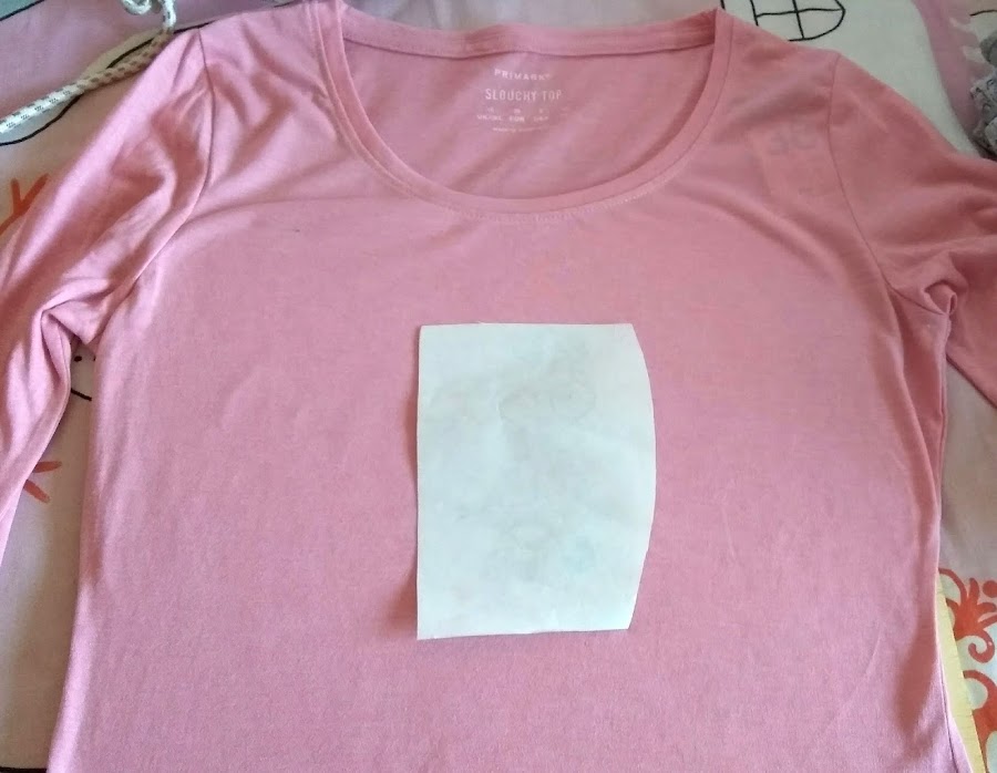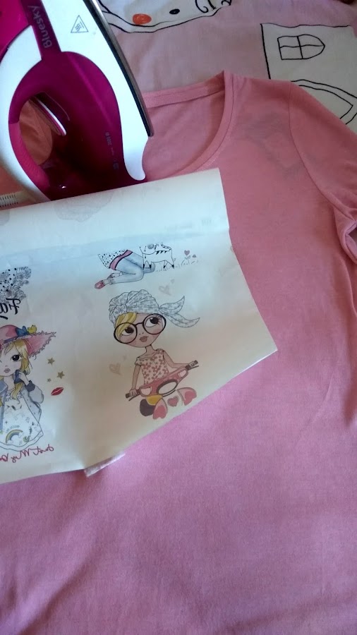 Si se aplica sobre tela, hay que tener en cuenta que tiene que ser de poliéster al menos en un 70% mas o menos y también hay que saber que la imagen tiende a trasparentar un poco, por lo tanto, lo mejor es usar camisetas o fondos blancos, aunque en mi caso utilicé una rosa clarita del Primark de 60% de Poliéster.