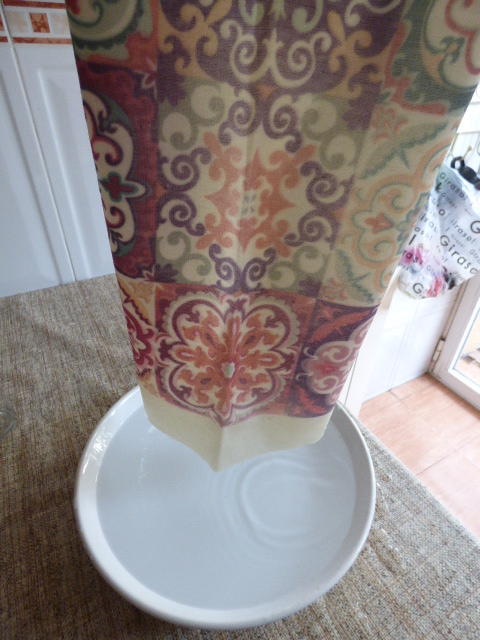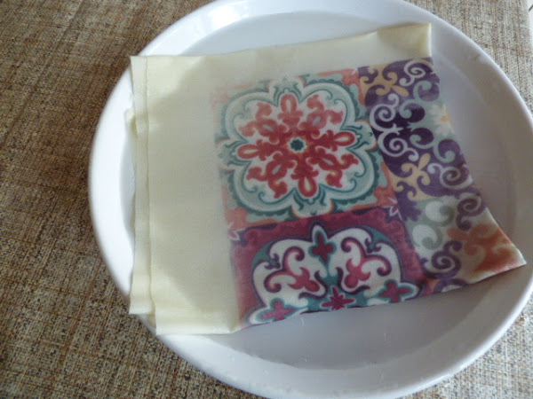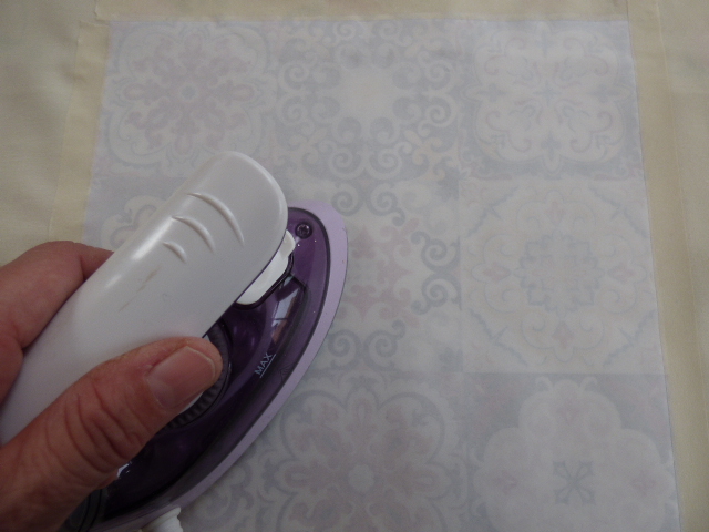 1--Sin hacerle nada a la funda (no hace falta lavarla como cuando hacemos decoupage en tela), ponemos el papel con el estampado hacia la tela y empezamos con el planchado, siempre, muy importante....sin nada de vapor.