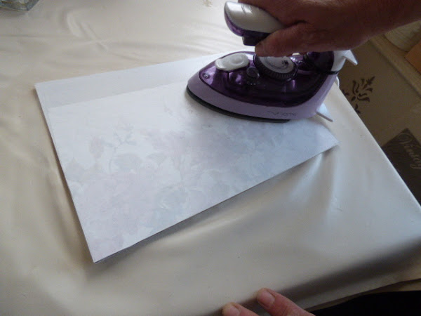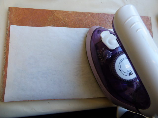 5--Con la plancha ya caliente y siempre sin vapor, empiezo el planchado.......no estamos planchando ropa...esto es diferente....la plancha tiene que estar quieta sobre el papel durante unos segundos, así vamos haciéndolo por sectores. Parece que el papel se tenga que quemar..... pero no.....es muy resistente