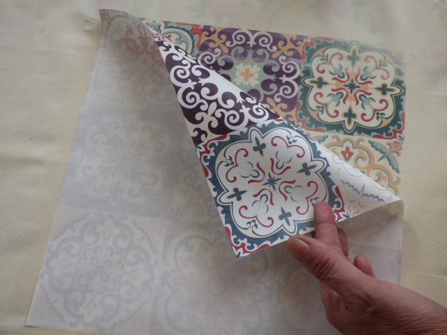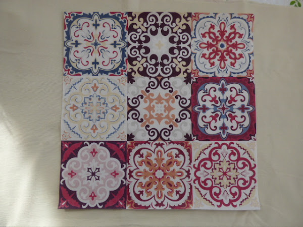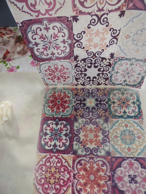 Esta es otra prueba con papel sublimación sobre tela. En este caso un retal que tenía de color crudo y el preciosisimo papel de baldosa hidráulica.