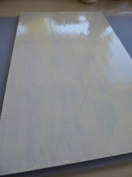 Pinté de blanco otra tablilla...dejé secar....extendí cola....dejé caer el papel de sublimación ya utilizado