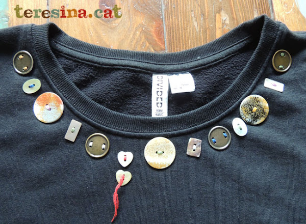 Ara ja estic pensant en canviar la decoració per la pròxima temporada. Potser hi cosiré unes boles de colors, o una tira de passamaneria, o potser hi pintaré alguna cosa. No ho se encara, però només cal descosir els botons i tornem a tenir la dessuadora bàsica.