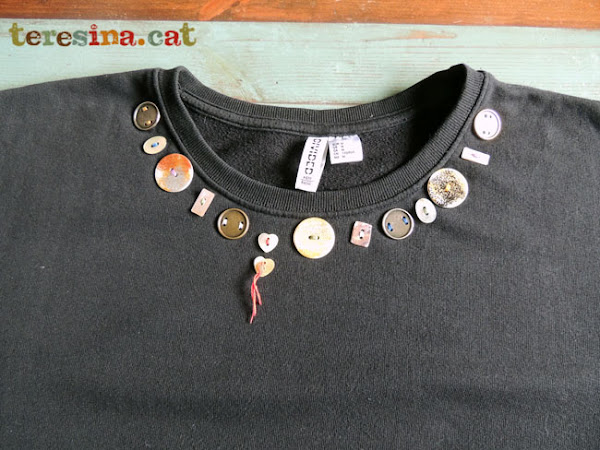 Ahora ya estoy pensando en cambiar la decoración para la próxima temporada. Quizás le coseré unas bolas de colores, o una tira de pasamanería, o quizás pintaré algo. No lo se aún, pero sólo hay que descoser los botones y volvemos a tener la sudadera básica.