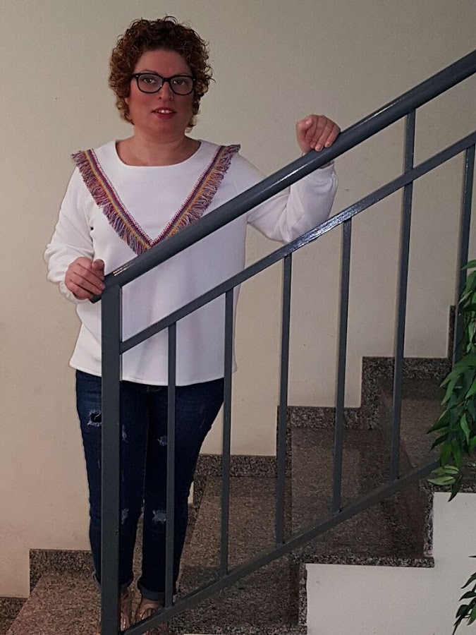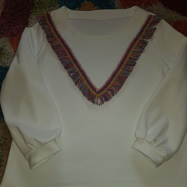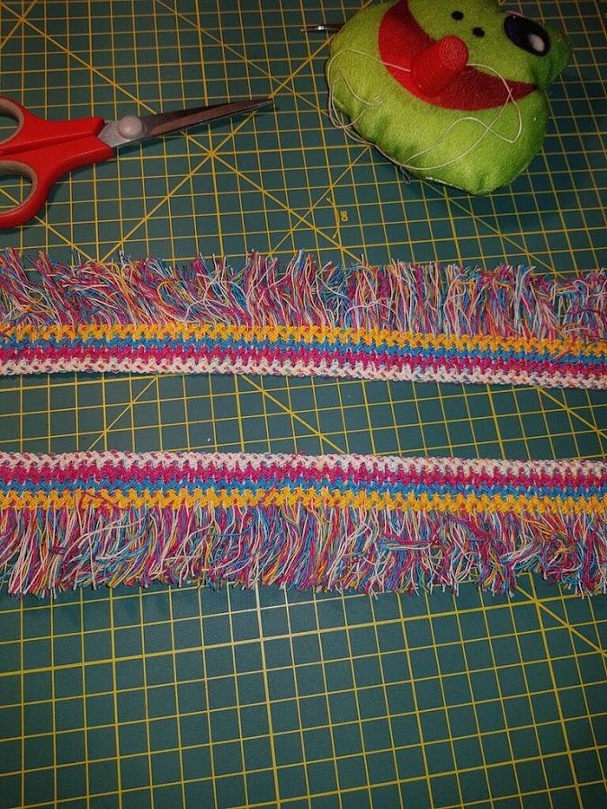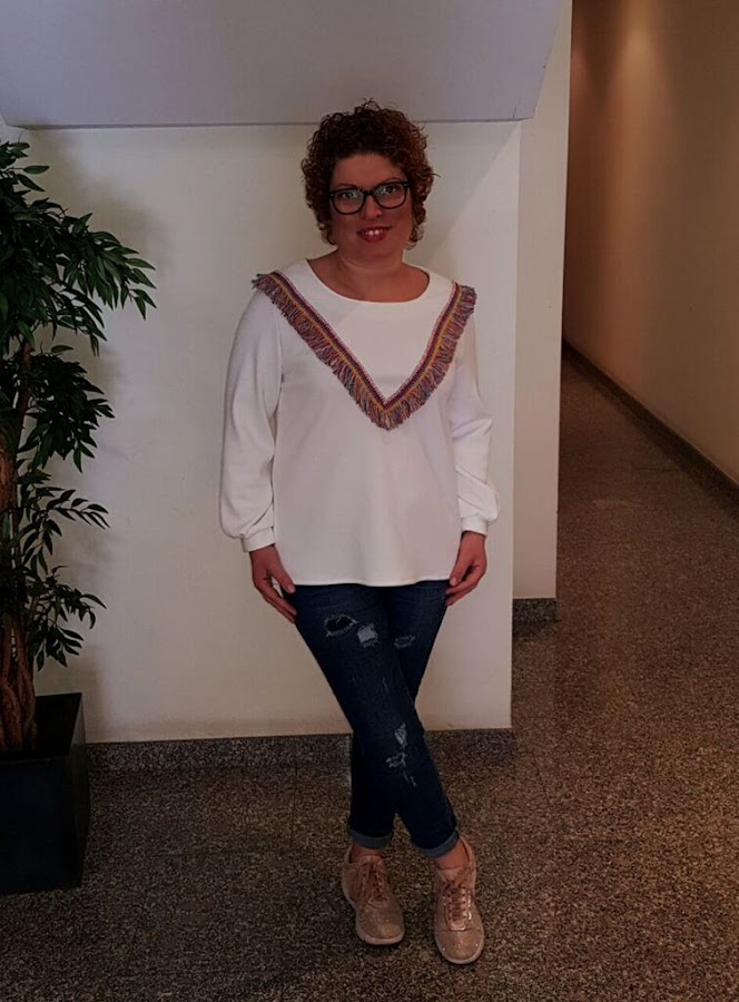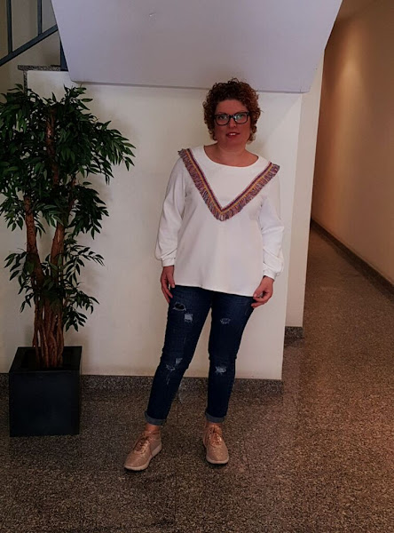 Como toda la sudadera de color blanco era un poco sosa , estuve dandole vueltas y al final me decidi por estos flecos de colores.