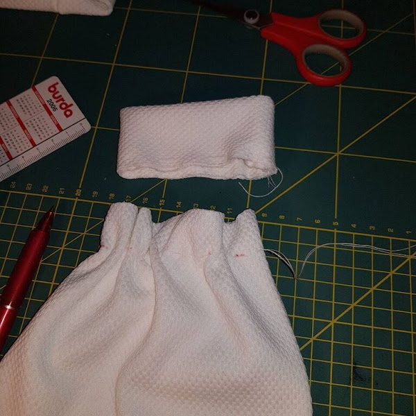 En las mangas he puesto puños que son muy faciles y rapidos de hacer , tan solo hay que fruncir un poco la manga , cortar una tira de tela a la medida de la muñeca y doblarla por el ancho deseado y coser a la manga.