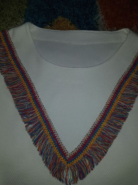 No tenia muy claro como colocar los flecos y al final me decidi por hacer una V gigante en el delantero.