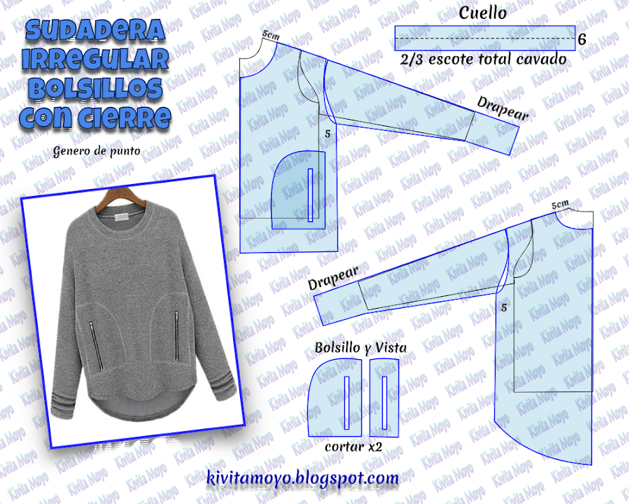 Usar generos de punto y/o frizados. Trazar a partir del patron base de camiseta a medida. Cavar el escote 5 cm para incorporar un cuello cortado de una tira en direccion a la elongacion de la tela, con un ancho de 6 cm por 2/3 el contorno del recorrido del escote ya modificado. En el lateral dar una holgura extra de 5 cm ( esto es a consideracion de el gusto de la persona) y prolongar el hombro pasando de la manga basica original mas alla de la altura de copa. Restar a la manga esta prolongacion del hombro y dar un excedente en el puño para drapear. Esto puede obviarse a gusto. Trazar el trasero con el mismo proceder, pero dando mas largo al la linea central del patron en el bajo. Diseñar el bolsillo y su vista para colocar un cierre.