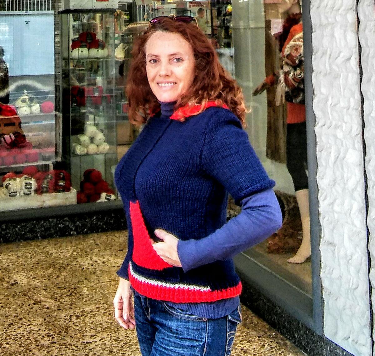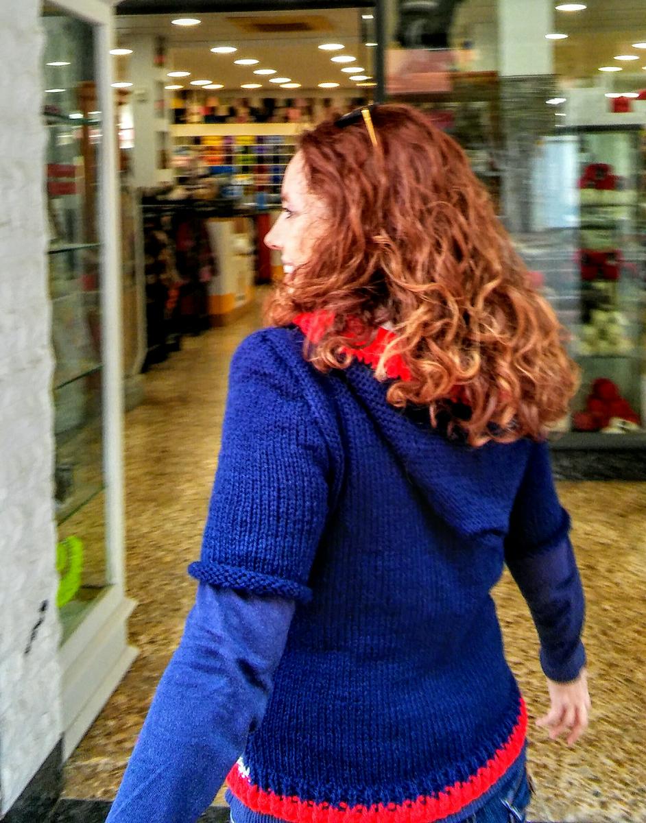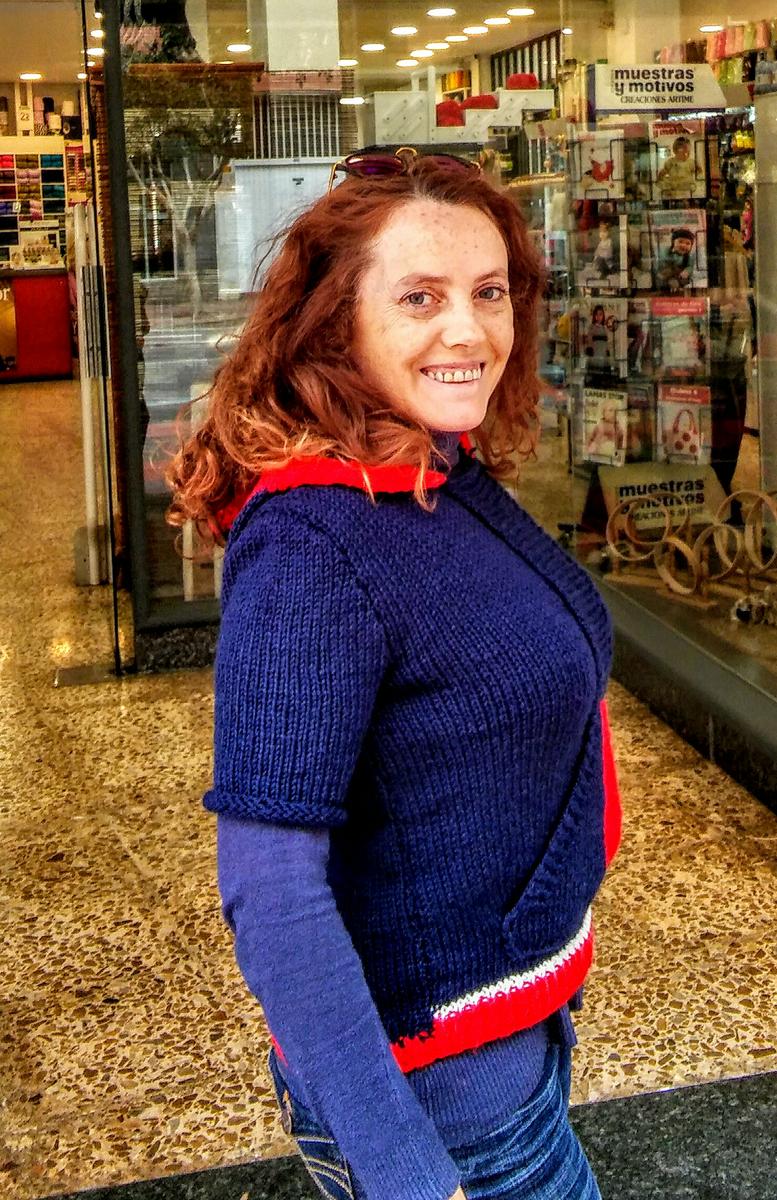 Hola a todas. Esta sudadera es el último trabajo que he realizado en punto. Un modelo clásico en azul marino con detalles en color rojo y blanco.