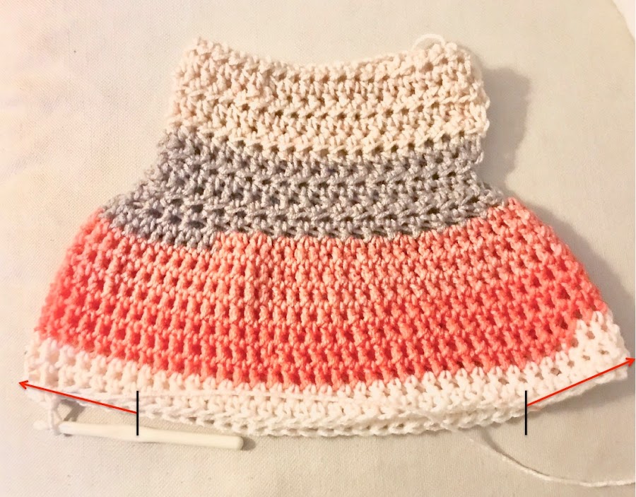 Continuamos tejiendo solo el cuerpo (con medios puntos altos hasta el largo deseado) de la siguiente manera: justo antes del marcador hacemos 3-4 puntos de cadeneta al aire (para un adulto, 5-6 cadenetas o las que veáis, podéis ponéroslo y ver si queda muy estrecho o no, depende del pecho) y unimos con la parte trasera/delantera (esto dará amplitud a la sisa).