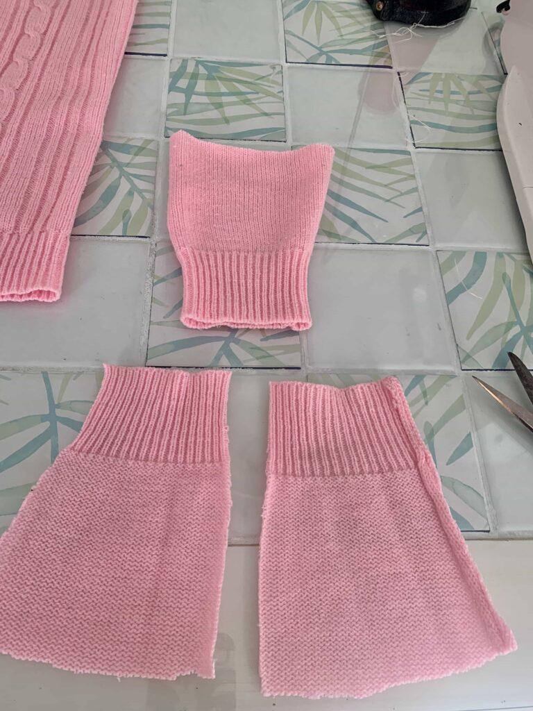 Corto parte de arriba del suéter recta, cortando el cuello… También corto un rectángulo en sentido vertical de la espalda que aprovecho para el cuello alto.