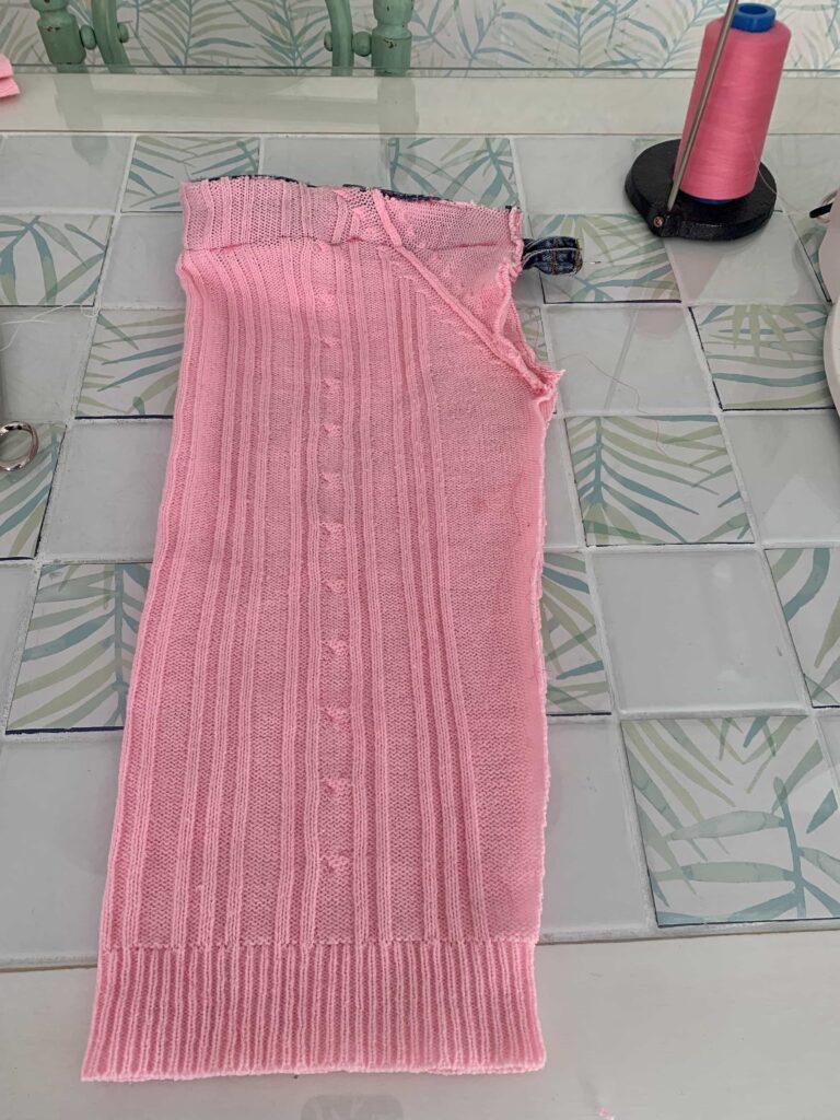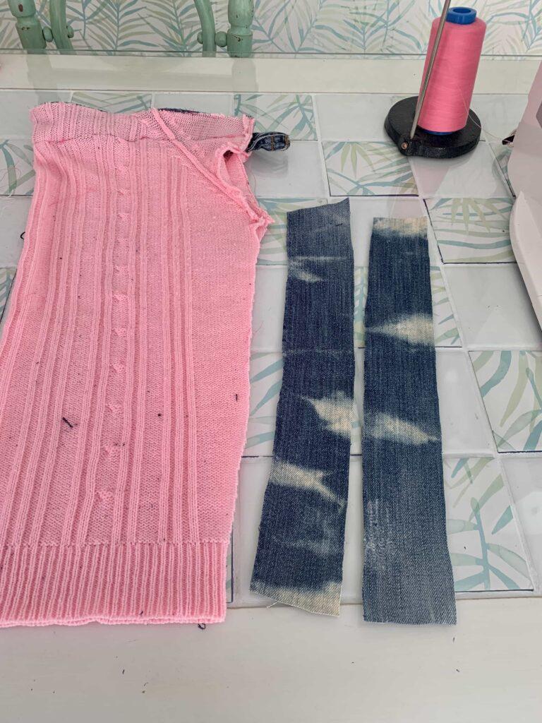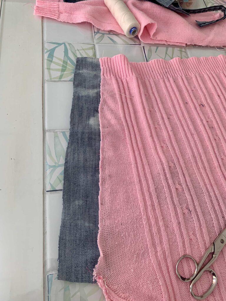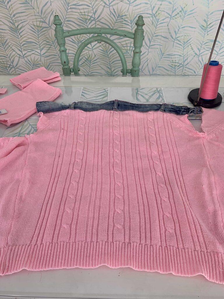 Añado en la parte alta del suéter la cintura del vaquero que he cortado en el primer paso.