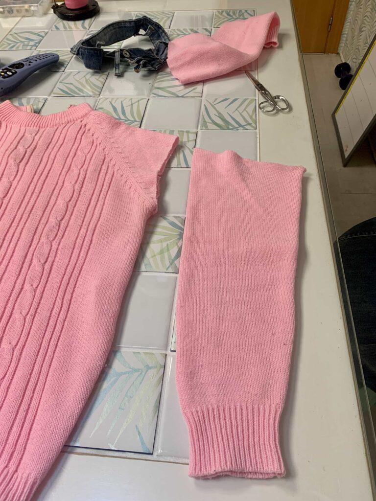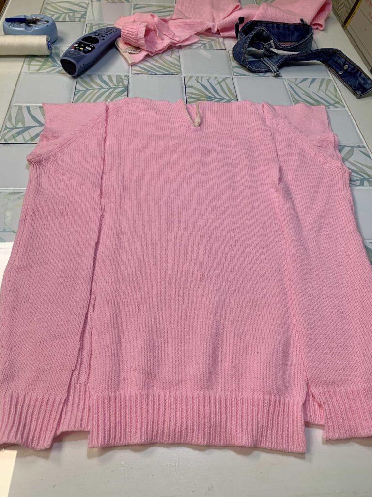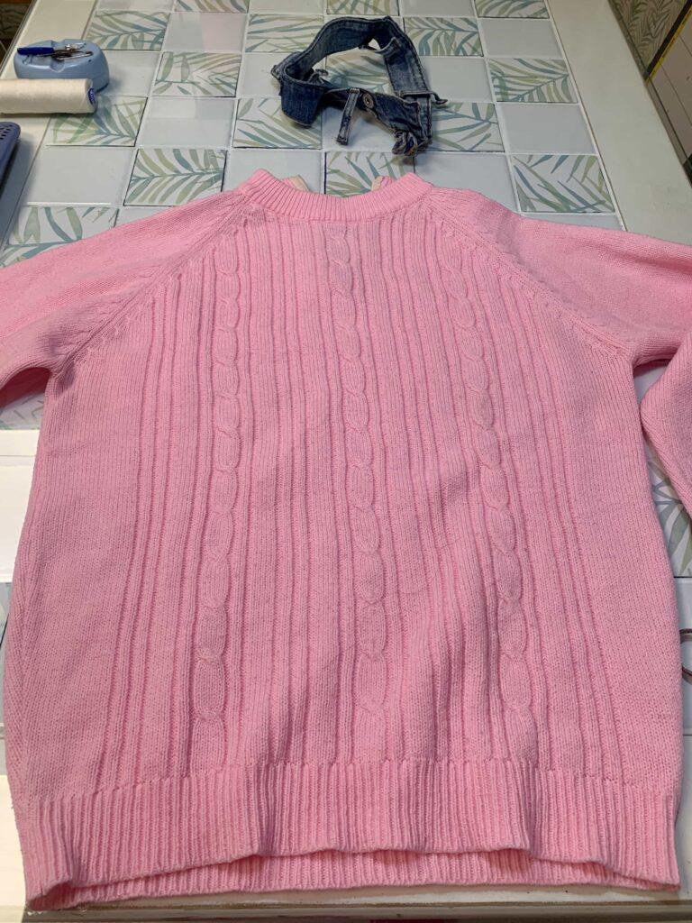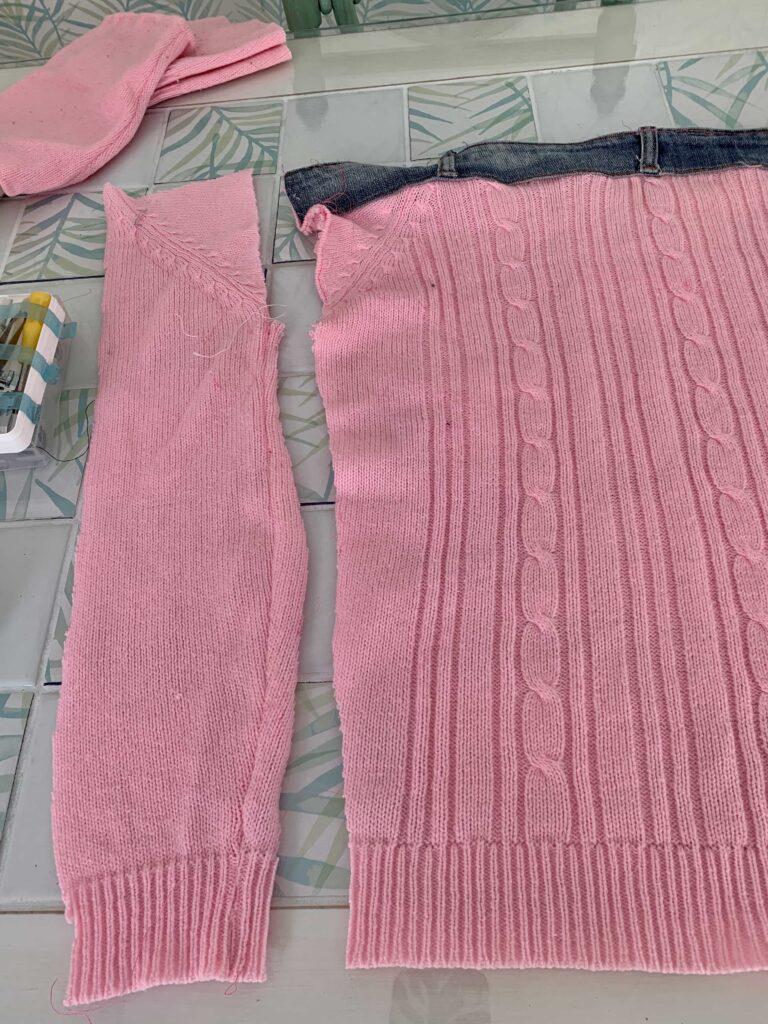 Añado en la parte alta del suéter la cintura del vaquero que he cortado en el primer paso.