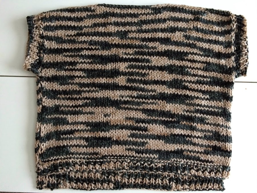 Una vez acabado seguía sin convencerme pues las mangas y los bajos se doblaban (a pesar de haberlo planchado). Entonces se me ocurrió hacer 4 vueltas de punto elástico 1/1 en las mangas