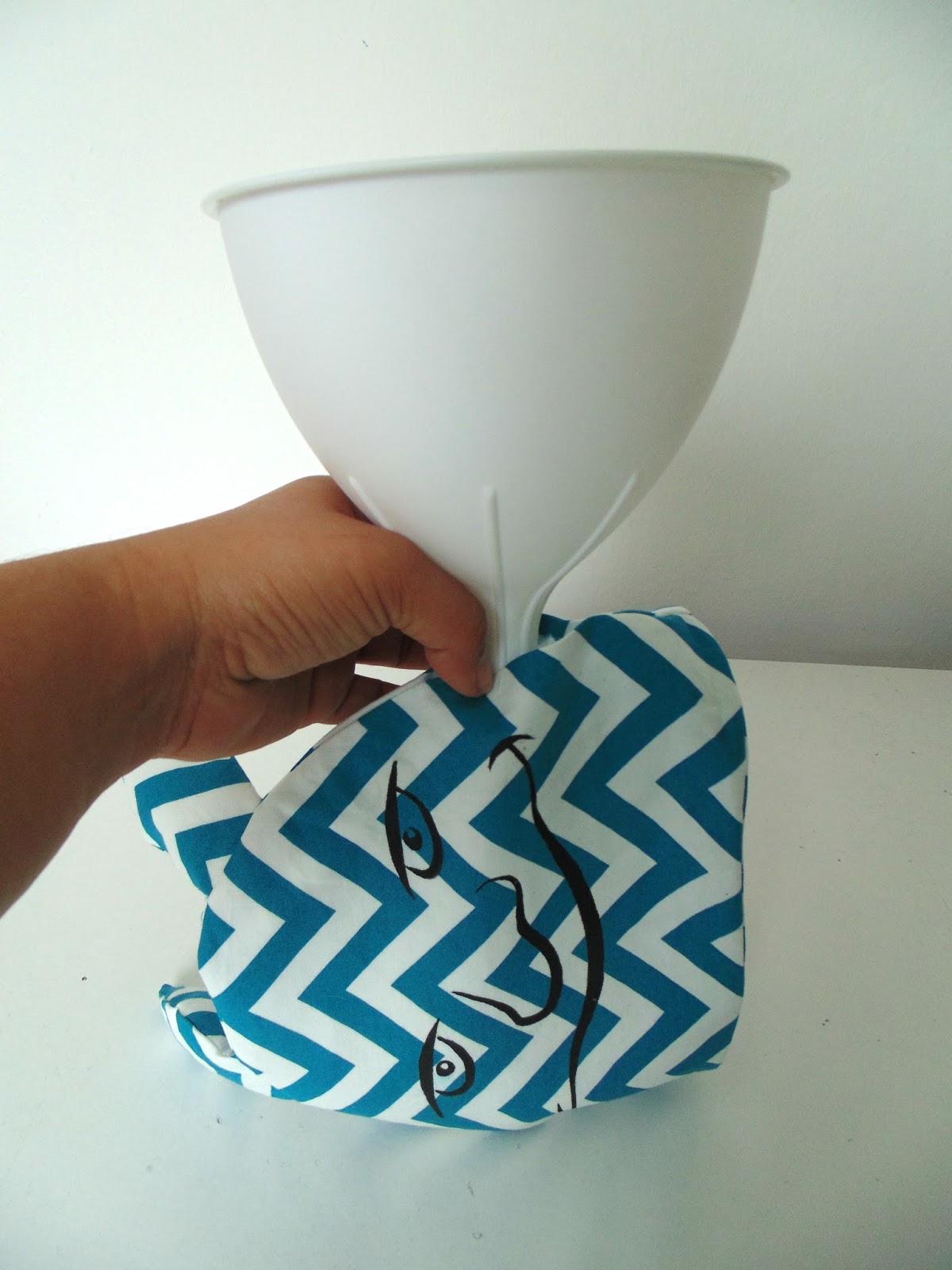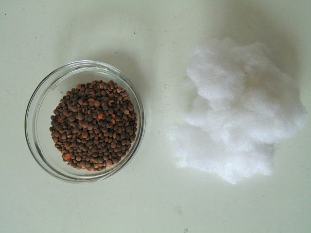 He dado la vuelta y rellené con relleno para cojines (no sé cual es el nombre original de este tipo de relleno) y lentejas para dar el peso que necesitaba. Para facilitar utilicé un embudo para las lentejas.