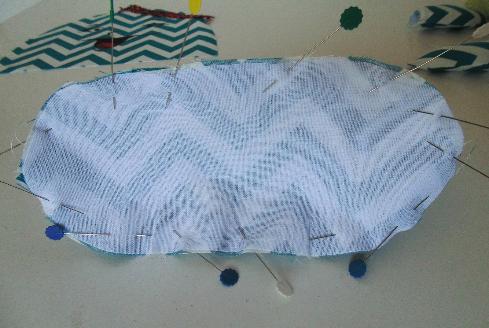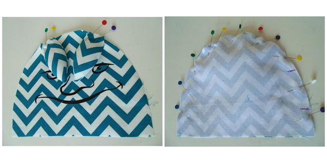 Acomodé las orejas entre las dos partes del cuerpo y sujeté con alfileres. Cosí al alrededor dejando la parte de la base sin coser y una abertura en la lateral para dar la vuelta y rellenar.