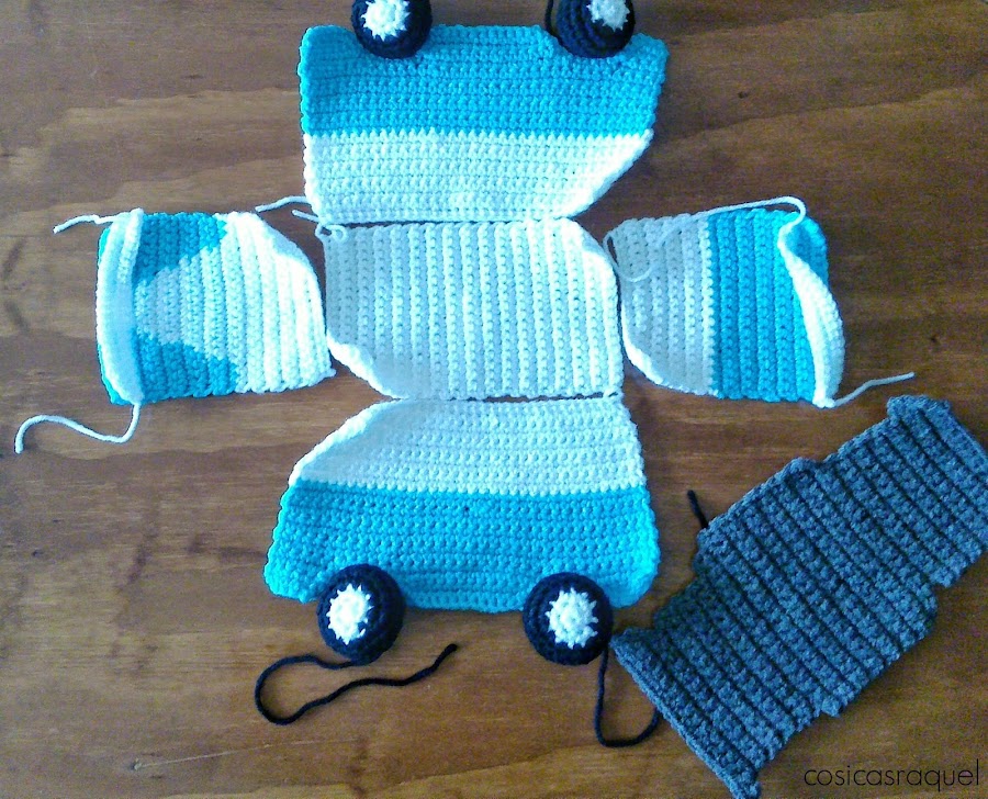 Une la parte delantera y trasera al techo con puntos bajos , cose las ruedas a los huecos, cose el resto con punto invisible ,en inglés mattress stitch para que lo busques en google si no sabes hacerlo.