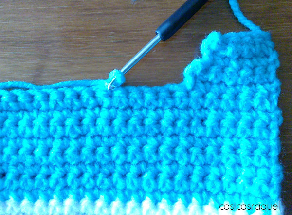 Vuelve a enganchar la lana en la fila 18 salta 4 puntos (en el 5º empieza con 1pb)